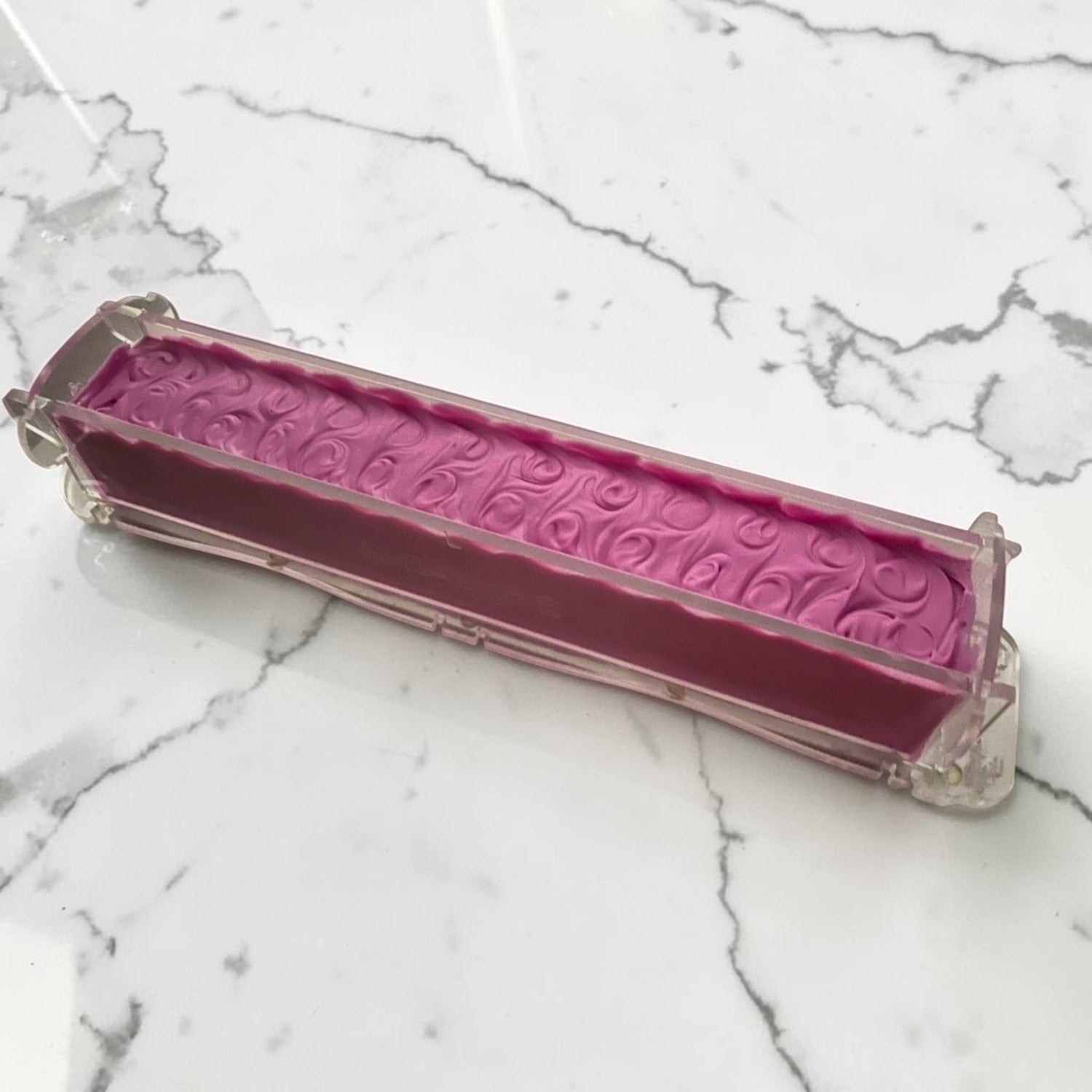 Découvrez Prune des Fées à l’état brut : un pain de savon fraîchement coulé, encore en phase de repos avant sa transformation en tranches prêtes à l’usage.